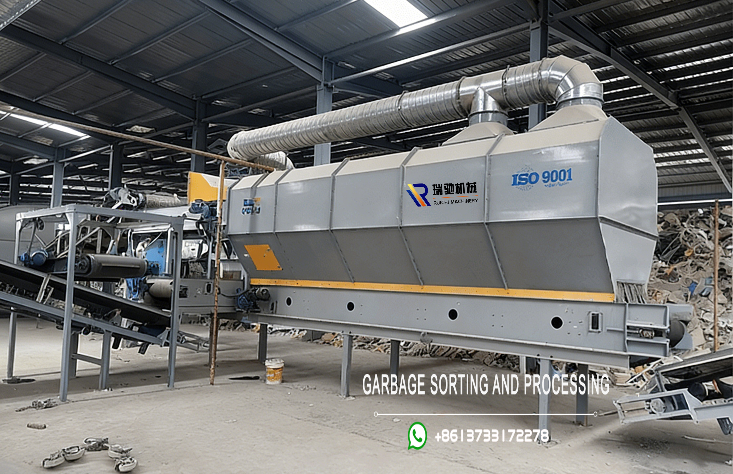 Working Principle: Mixed materials, after preliminary processing by Double-Shaft Shredder or Plastic Shredder Machine, are fed into the separator (via Conveyor Belt or Waste plate feeder), and under the combined action of airflow and rotating drum, lighter materials (paper, plastic bags, films, cloth strips processed by textile shredder machine) are carried by the airflow to the settling chamber or distant discharge belt; heavier materials (metals separable by Eddy Current Separator, stones, glass, ceramics) fall naturally due to gravity or inertia to the heavy material discharge belt. The fan speed and dampers are adjustable to optimize sorting efficiency and purity, and the exhaust duct connects to a dust removal and deodorization system to meet emission standards, supporting the operation of waste sorting machine and garbage separation machine.